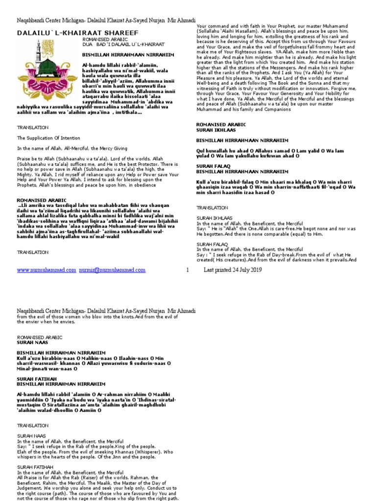Allahumma shalli ala sayyidina Muhammadinil Fatihi lima ughliqa wal khatimi lima sabaqa nashiril haqqā bil haqqi wal hadi ila shiratikal mustaqim wa ala alihī wa. Allahummaghfirlahu warhamhu wa afihi wafuanhu. Allahumma shalli wa sallim wa barik ala sayyidina Muhammadinil-fatihi lima ughliqa wal-khatimi lima sabaq nashiril haqqi bil haqqi wal-hadi ila shirathikal mustaqim.