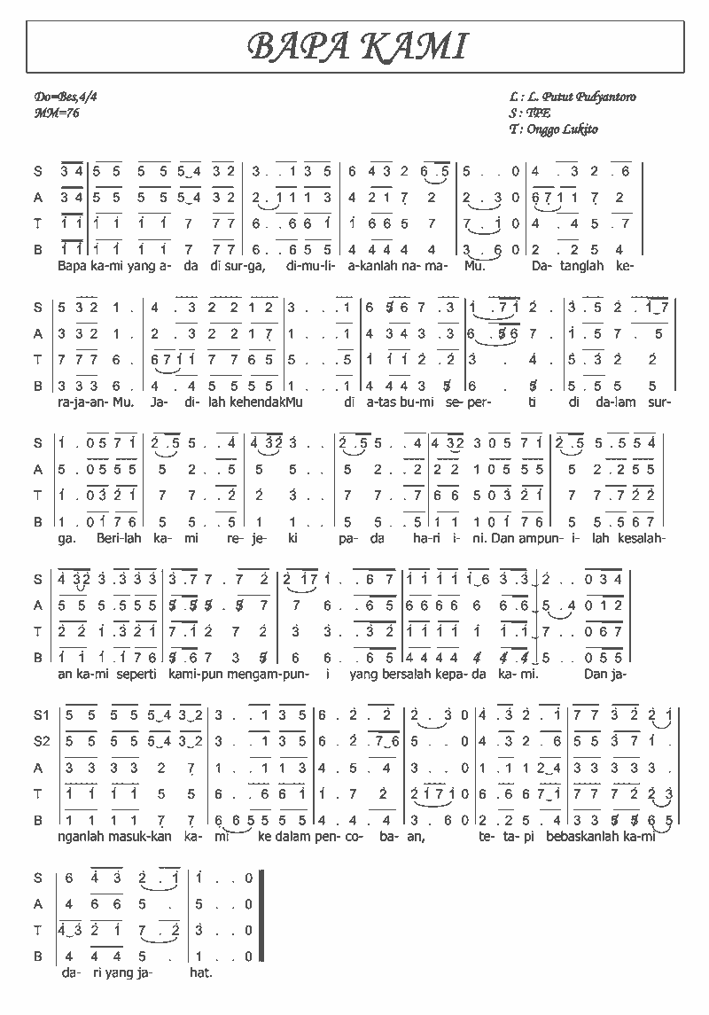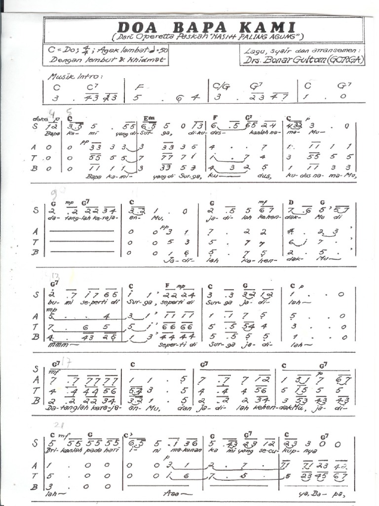 Teks dan notasi angka lagu Doa Bapa Kami karya Bonar Gultom. Doa Bagi Kota Tercinta Willy Soemantri Key. Bapa kami yang ada di surga Dikuduskanlah nama-Mu datanglah Kerajaan-Mu jadilah kehendak-Mu.