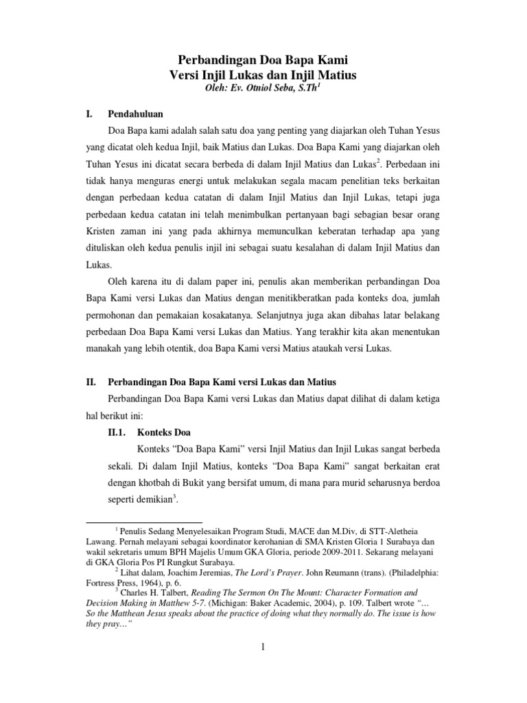 Injil Luk 112-4 Pemahaman Doa Bapa Kami. Versi pertama yang lebih panjang dan yang lebih dikenal banyak orang terdapat dalam Injil Matius 69-13. Tersebut diterjemahkan sebagai berikut.