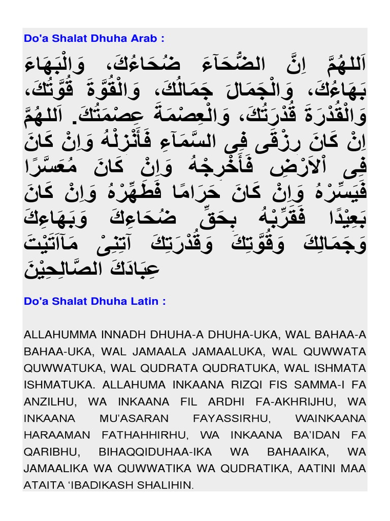 Doa dan dzikir setelah sholat Dhuha ini dibaca berurutan selepas menunaikan sholat. Setelah selesai sholat kita tentunya menyempatkan untuk berdoa dan tidak langsung meninggalkan tempat ibadah. اللهم ان الضحاء ضحاءك والبحاء بحاءك وجمال جمالك والقوة قوتك والقدرة قدرتك والعصمة عصمتك.