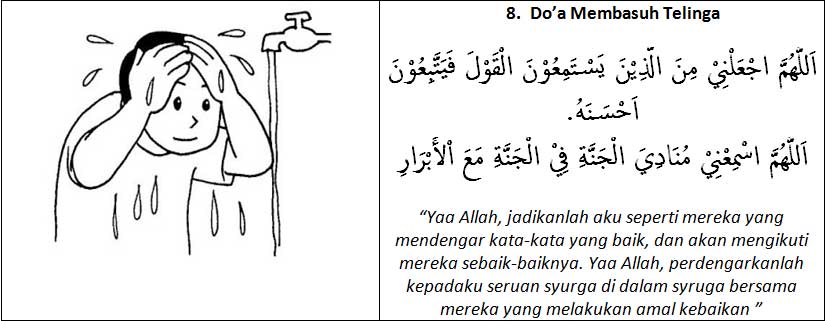 Artinya saat wudhu Nabi shallallahu alaihi wa sallam memisah antara kepala dan telinga tidak bersambung. Kedua doa tersebut merupakan doa yang diajarkan Rasulullah shallallahu alaihi wa sallam dan terdapat di dalam hadits shahih lagi hasan. 236 dari jalur Harun bin Maruf Harun bin Said Al-Ayliy dan Abu Thahir dari Abdullah bin Wahb seterusnya.