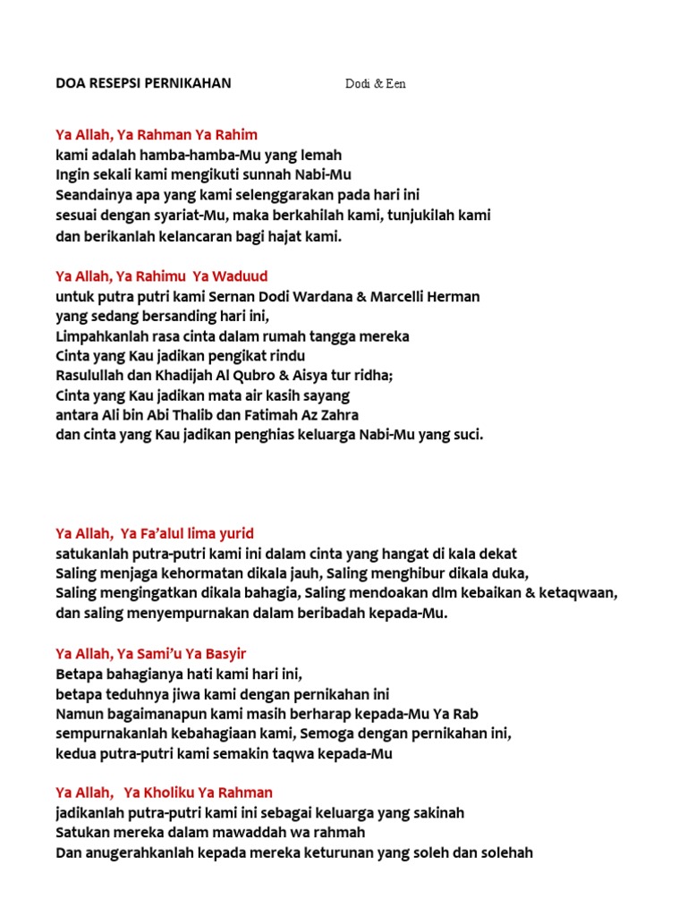 May 04 2018 Penulis memberikan Contoh Doa Resepsi Pernikahan Secara Agama Islam Bahasa Indonesia karena melalui email yang ditujukan kepada penulis banyak pembaca meminta untuk di berikan contoh doanya agar mudah dipelajariDan dalam kesempatan tulisan ini saya berikan link contoh-contoh terkait dengan upacara pernikahan.