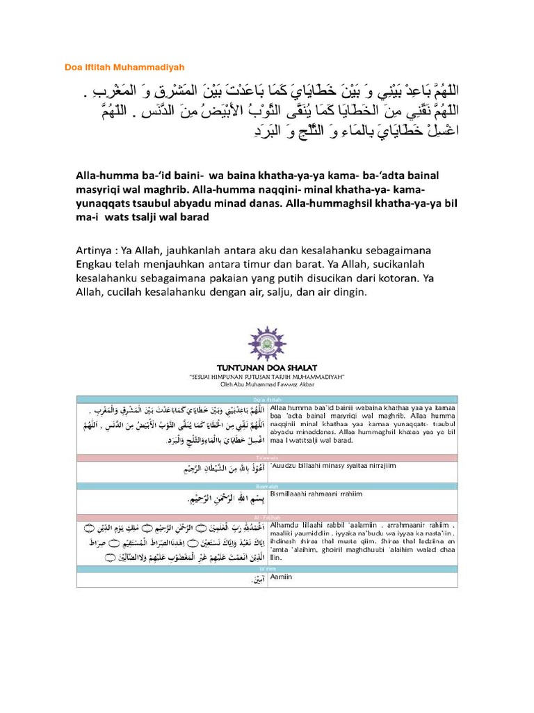 Gerakan Pencerahan Menuju Indonesia Berkemajuan Refleksi Proyeksi dan Rekomendasi Pidato Iftitah. Bacaan doa iftitah dan Artinya untuk Muhammadiyah dan NU ini ditujukan buat yang baru belajar bacaan sholat terutama yang belum bisa mengaji bisa memilih tulisan latin saja tanpa perlu membaca lafadz Arab nya dan juga yang pendek agar lebih memudahkan. Bacaan Iftitah dan terjemahannya Doa Iftitah dalam Sholat Doa Iftitah Allaahumma baid baini Doa Iftitah menurut sunnah.