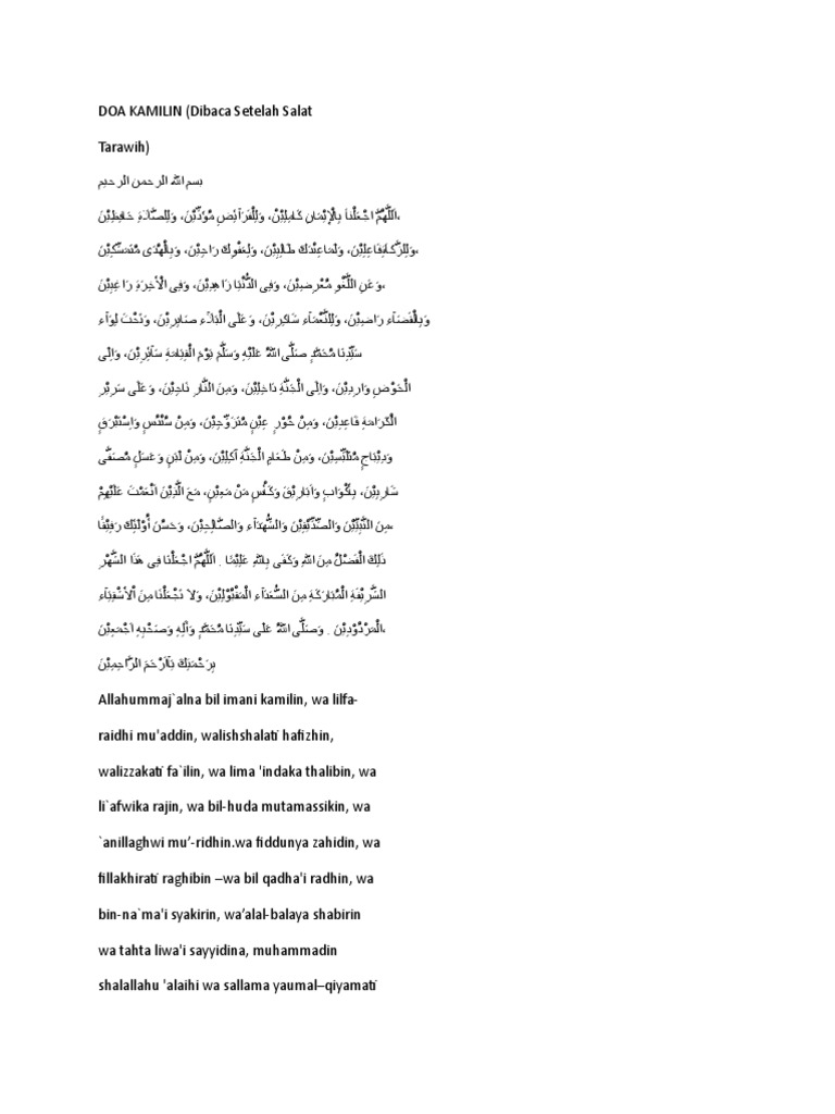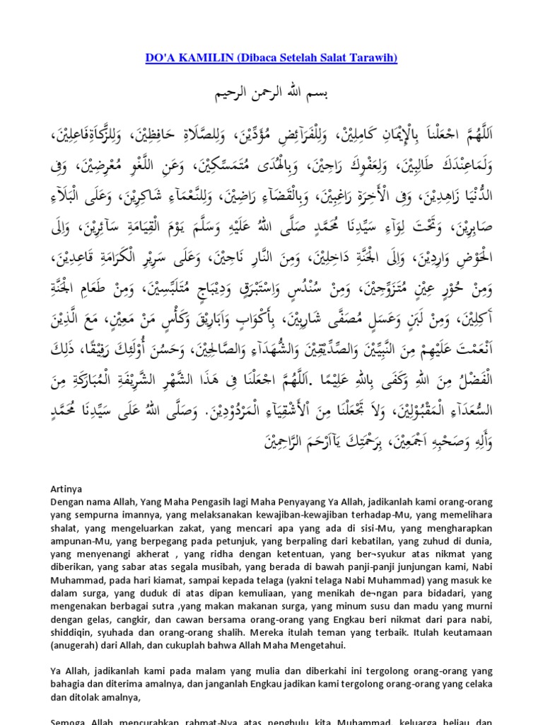 May 07 2020 Doa kamilin Doa Setelah Shalat Tarawih lengkap dengan bacaan Arab bacaan Latin dan terjemahannya dalam bahasa Indonesia. Langsung saja silahkan simak bacaan lafadz doa kamilin dalam bahasa Arab dan artinya serta tulisan latin yang benar sesuai sunnah berdasarkan hadits shahih dalam bahasa Arab tulisan latin dan artinya atau terjemahan bahasa Indonesia. Di mana mereka konsisten menjalankan setiap ajaran Islam mulai dari sholat puasa zakat dan masih bayak lagi.