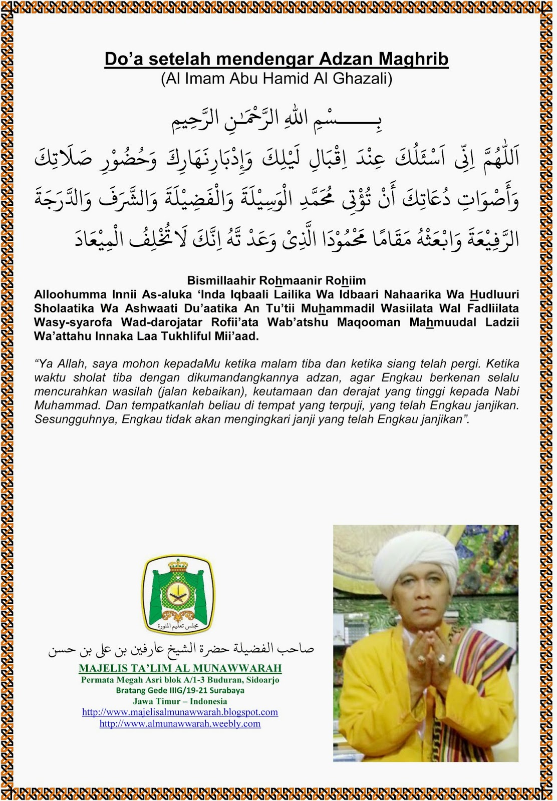 Rasulullah mengajariku agar aku menucapkan doa ini ketika adzan maghrib. Barang siapa ketika mendengar adzan lalu mengucapkan doa setelah adzan maka masuklah syafaatku baginya di hari kiamat HR. Barang siapa ketika mendengar adzan lalu mengucapkan doa setelah adzan maka syafaatku baginya di hari kiamat.