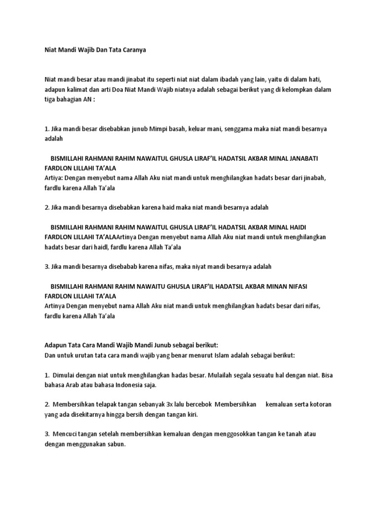 Sep 11 2019 Bacaan doa mandi junub setelah haid dalam bahasa Indonesia. Setelah melakukan hadast besar mandi junub atau mandi besar dilakukan agar umat Islam kembali bisa melakukan kewajiban atau. Dan di dalam mandi besar atau junub ini sudah ada aturannya di dalam agama Islam juga adab mengerjakannya untuk kita taati.