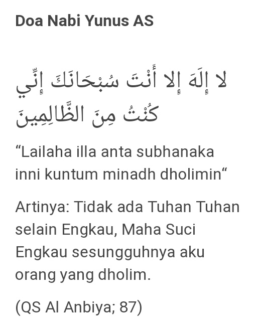 AGAMA I LA Salah satu doa dalam kehidupan yang menjadi doa mustajabah berupa untaian doa yang dibacakan oleh Nabi Yunus As saat beliau dalam perut ikan. Doa Nabi Yunus merupakan bentuk pengakuan manusia atas dosa-dosa yang dilakukan serta mengakui kekuatan Allah SWT sebagai Tuhan yang Maha Esa. Doa Dzun Nuun Nabi Yunus ketika ia berdoa dalam perut ikan paus adalah.