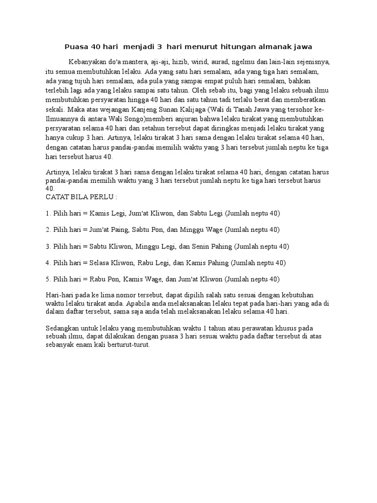 Puasa 3 hari ngebleng. Menunjukkan makna lebih umum ketimbang shaum. Pilih hari Kamis Legi Jumat Kliwon dan Sabtu Legi Jumlah neptu 40 2.
