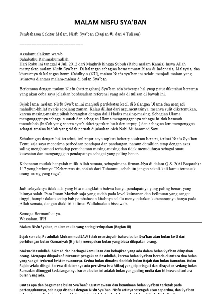 doa nisfu syaban tulisan arab pdf. Amalan tersebut adalah membaca doa wirid atau dzikir sesudah sholat nisfu syaban yang benar dalam bahasa Arab tulisan latin dan terjemahan Indonesia secara lengkap. Konten ini diproduksi oleh Berita Hari Ini. Untuk sholatnya sendiri agar semakin sempurna maka jemaah bisa membaca doa setelah sholat nisfu syaban mustajab.
