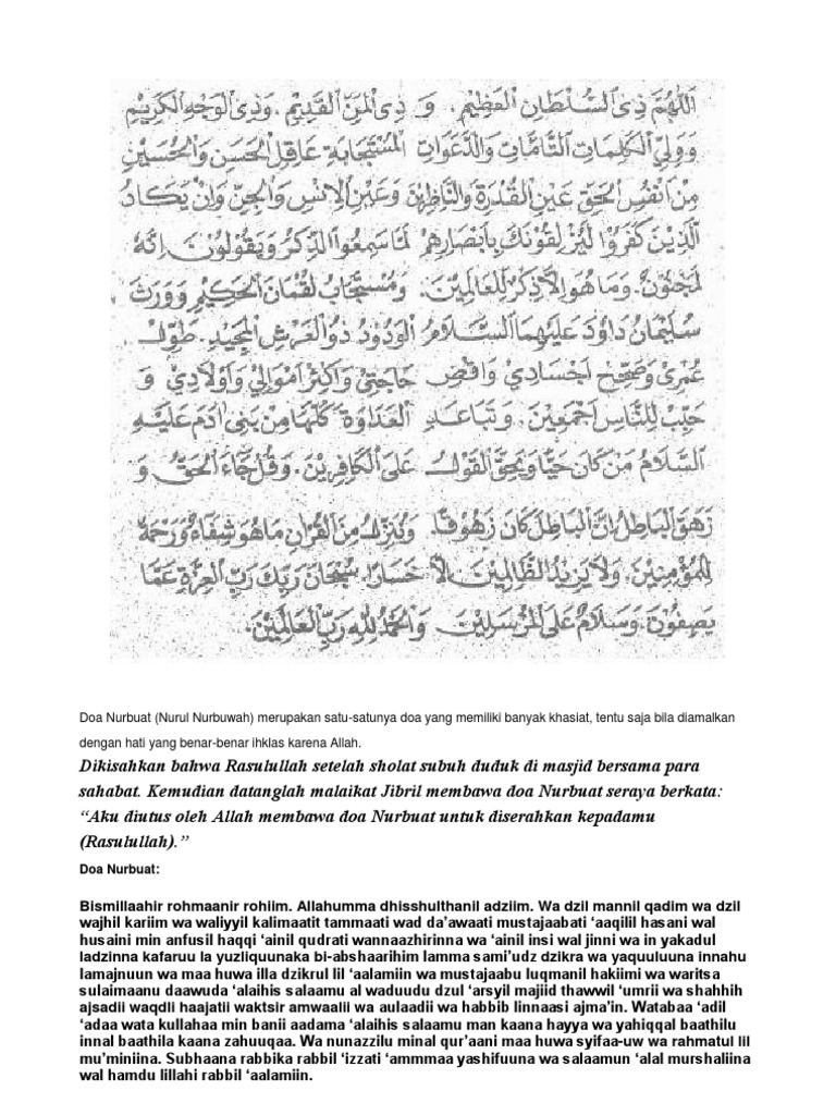 Khasiat yang terkandung dalam doa Nurbuat antara lain. Baik kebaikan di dunia maupun kebaikan di akhirat. Rahasia Doa Nurbuat Menurut Ajaran Kanjeng Sunan Kalijaga Doa Nurun Nubuwwah adalah salah satu doa yang sangat dianjurkan oleh Nabi Muhammad SAW karena memiliki manfaat yang sangat besar.
