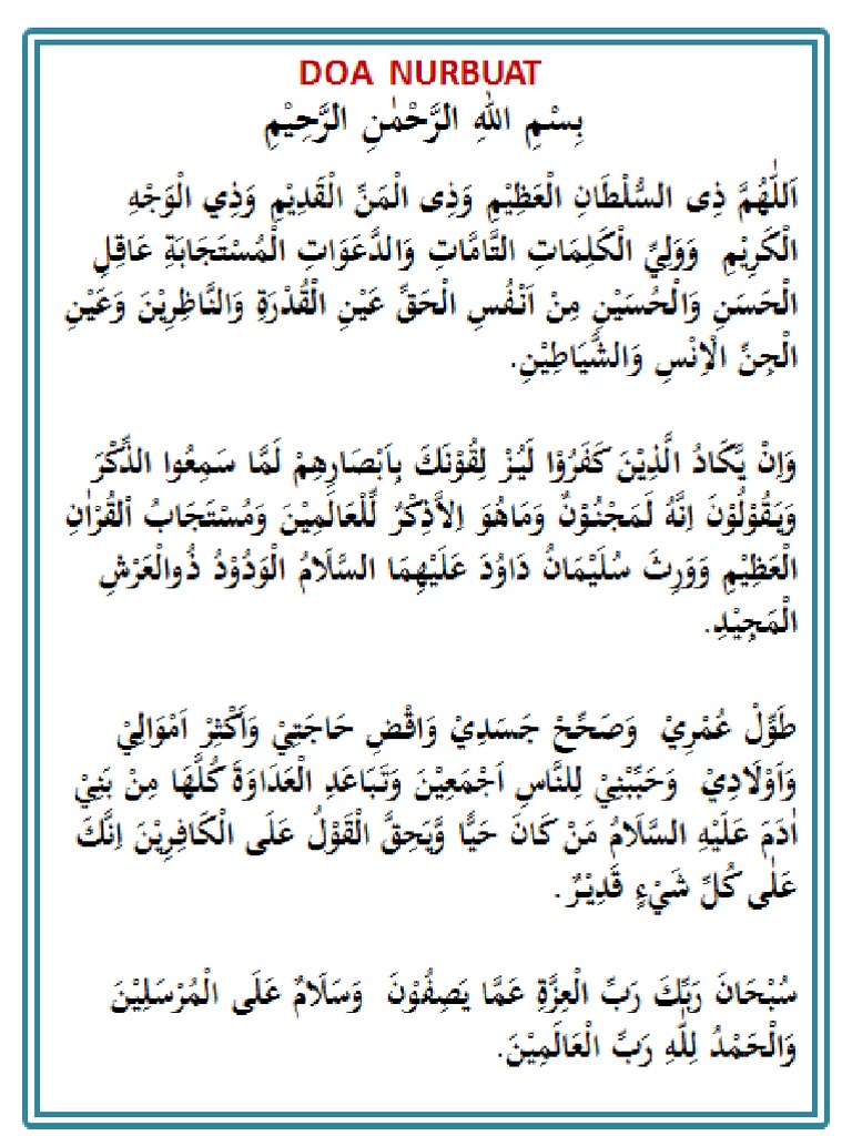 doa nurbuat gratis. Nurbuat adalah doa yang dipercaya memiliki banyak khasiat antara lain seperti Dapat disayangi oleh musuh dicintai wanita-wanitajika dibaca ketika hendak keluar rumah maka dapat menjadi penjaga rumah dari gangguan jin sihir santet dan bahaya lainnya. Lantas bagaimana cara kita menghadapi persoalan hidup kita. Salah satu Doa yang memiliki banyak khasiat diturunkan Allah adalah Doa Nurbuat Nurul Nurbuwahkhotamun Nubuah syarat utama mengamalkannya agar mutazab dengan berlaku ihklas.