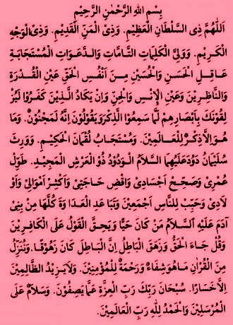 Wa dzil mannil qadim wa dzil wajhil kariim wa waliyyil kalimaatit tammaati wad daawaati mustajaabati aaqilil hasani wal husaini min anfusil haqqi ainil qudrati wannaazhirinna wa ainil insi wal jinni wa in yakadul ladzinna kafaruu la yuzliquunaka bi-abshaarihim lamma samiudz dzikra wa yaquuluuna innahu lamaj.