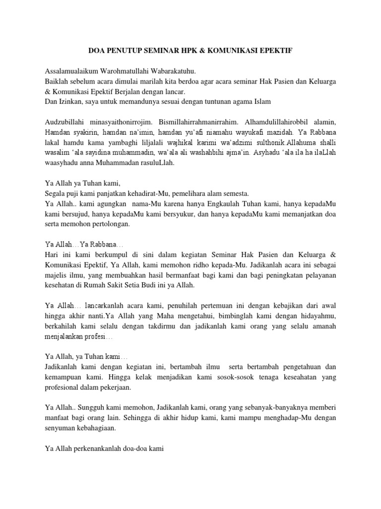 Dalam berdoa kepada Allah hendaknya terlebih dahulu ada muqadimah atau pembukaan. View 360386150-Doa-Shalat-2docx from KEDOKTERAN 2231231233 at YARSI University. Doa penutup acara assalamu alaikum warwab marilah kita sejenak menundukkan pandangan kita dan seraya bermunajat kepada allah agar acara kita pada hari ini diterima dan diberkahi oleh allah swt.
