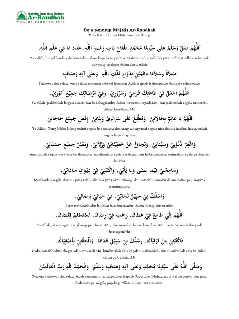 Sep 08 2018 Berikut bacaan doa kafaratul majelis penutup majelis yang sering dibacakan termasuk dalam sebuah majelis ilmu. Doa ini menutup sedikitnya 25-30 majelis taklim se-DKI Jakarta dalam sepekan yang diasuh KHM Syafii Hadzami Rais Syuriyah. - Pembacaan Maulid AdDibai Oleh Al Habib Abdulloh Bin Ali Al Attas - Ceramah Agama Oleh Al Habib Muhammad Bin Husen Alaydrus - Doa Penutup ACARA TERBUKA UNTUK UMUM PRIA.