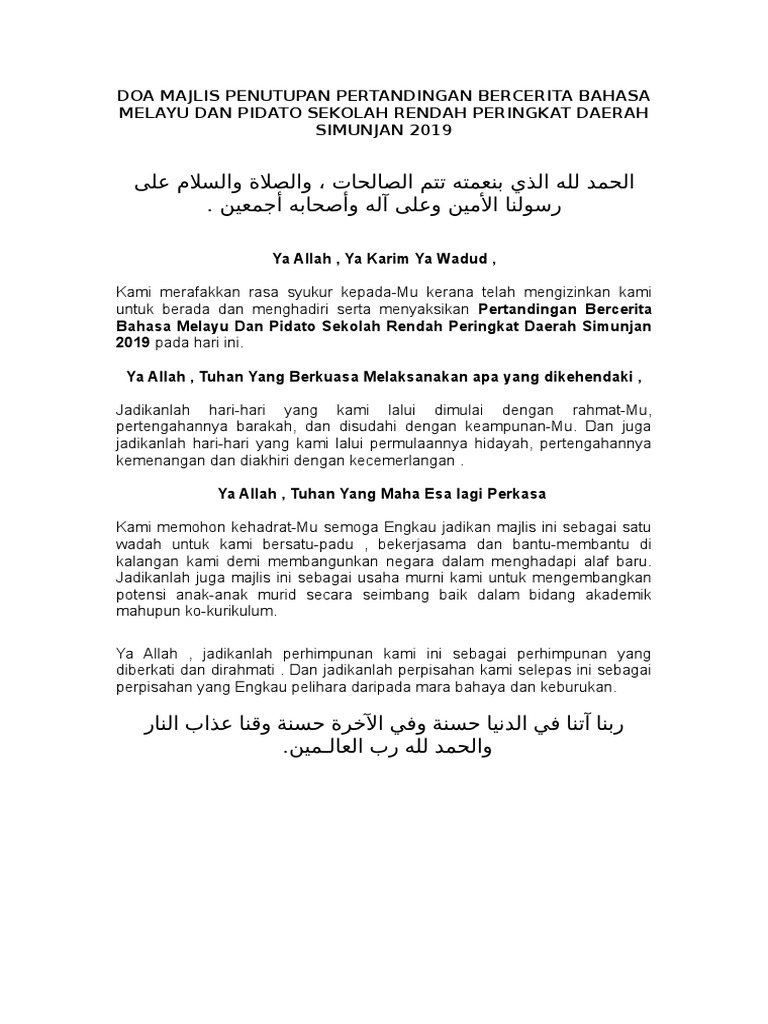 doa penutup majlis bahasa melayu. 12 idea pantun penutup majlis tanam sirih dalam taman gali lubang tepi perigi terima kasih hadirin budiman lain masa bersua lagi. Ya Allah kami merafakkan kesyukuran kepadaMu Ya Allah atas perkenan dan izinMuhari ini kami hamba-hambaMu mampu berhimpun dan berkumpul selama 2 hari bagi menjayakan Majlis. Meskipun perkumpulan tersebut hanya dihadiri oleh dua atau tiga orang saja.