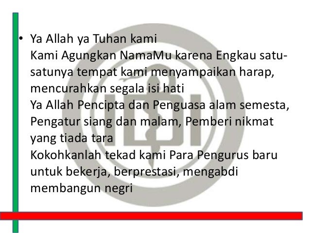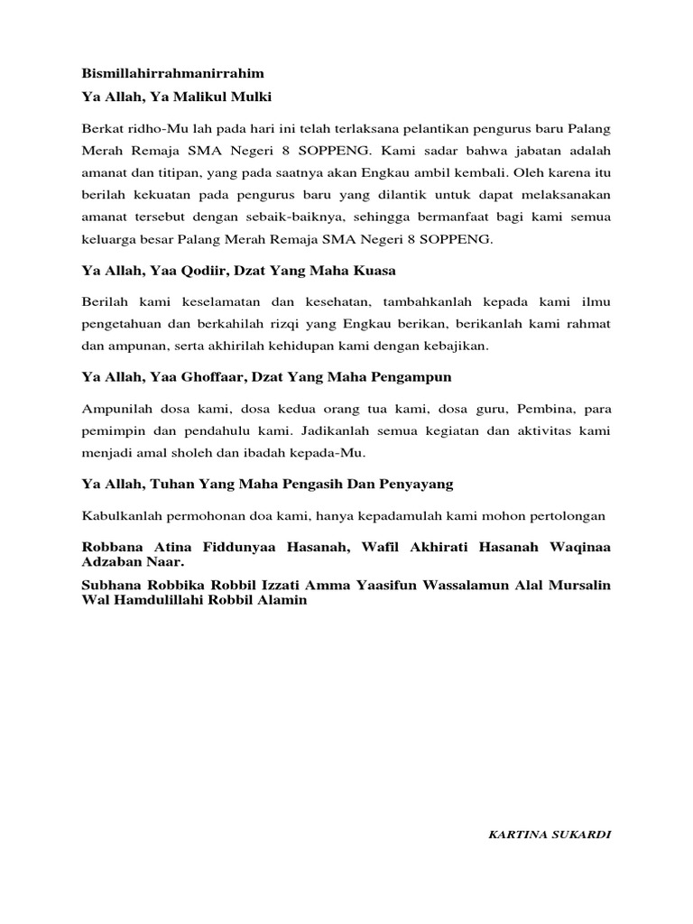 Di hari yang penuh berkah ini kami bermunajat menghadap kehadiratMu ya Allah untuk mempersembahkan rasa syukur yang sedalam-dalamnya atas berbagai nikmat yang telah Engkau curahkan kepada kami seraya memanjatkan doa kiranya acara Pelantikan dan serah terima jabatan Pengurus OSIS dan MPK SMA Negeri 1 Prambanan ini akan mendapat barokah dan ridha. Apr 25 2014 Doa Pelantikan Pengurus IDI 1. Podato ketua HMPS Fisika h.