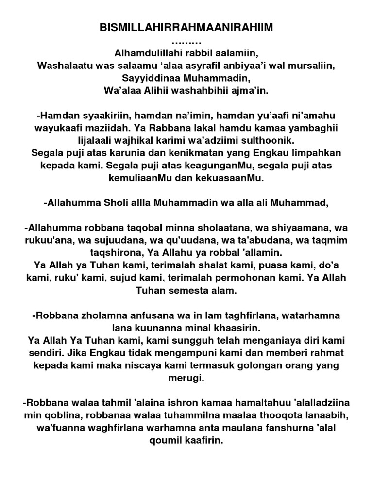 Yaa robbanaa lakalhamdu kamaa yambaghiilijalaali wajhikal kariimi wa azhiimi sulthaanik. Beberapa sekolah islam juga menggunakan istilah tersebut. Berikut ini Doa dan Zikir yang bisa dibaca.