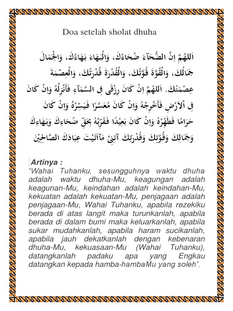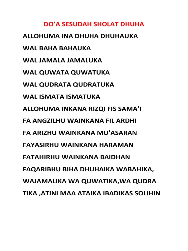 Doa-doa Sesudah SOlat a. Kedua tangan diangkat setinggi telinga dan membaca Allaahu akbar kemudian badan dibungkukkan kedua tangan memegang lutut dan ditekankan. Sholat Dhuha merupakan sholat sunah yang istimewa karena mempunyai banyak keutamaan atau manfaat.