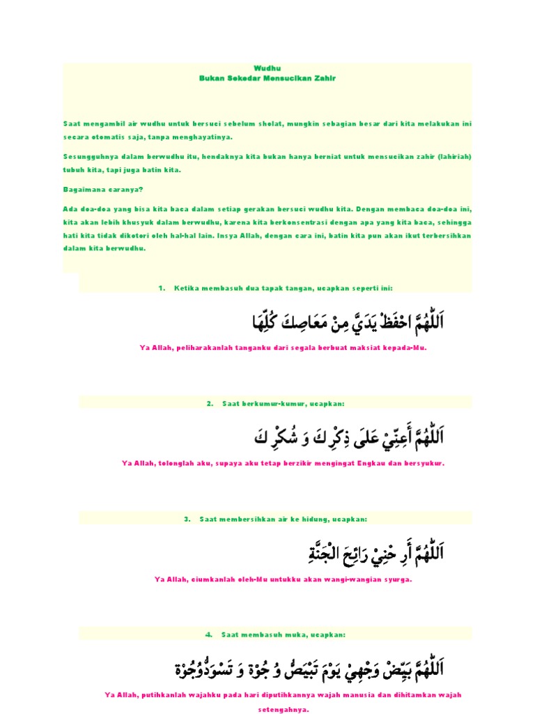 Diharapkan dengan membaca doa-doa tersebut wudhu kita dapat menambah kualitas ibadah kita. 8 cara berwudhu yang benar sesuai dengan ajaran Rasulullah dengan diiringi doa sebelum dan sesudah berwudhu dan doa setiap gerakan wudhu. Pada saat berwudhu pun kita diharu.