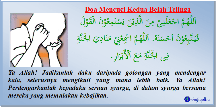 doa wudhu kuping. Dalam sebuah hadis Nabi Muhammad Saw. Yaitu berniat membasuh muka membasuh tangan hingga kedua siku. Karenanya tidak hanya melakukan fardhu wudhu umat Islam dianjurkan melengkapkannya dengan melakukan sunah-sunah wudhu juga.