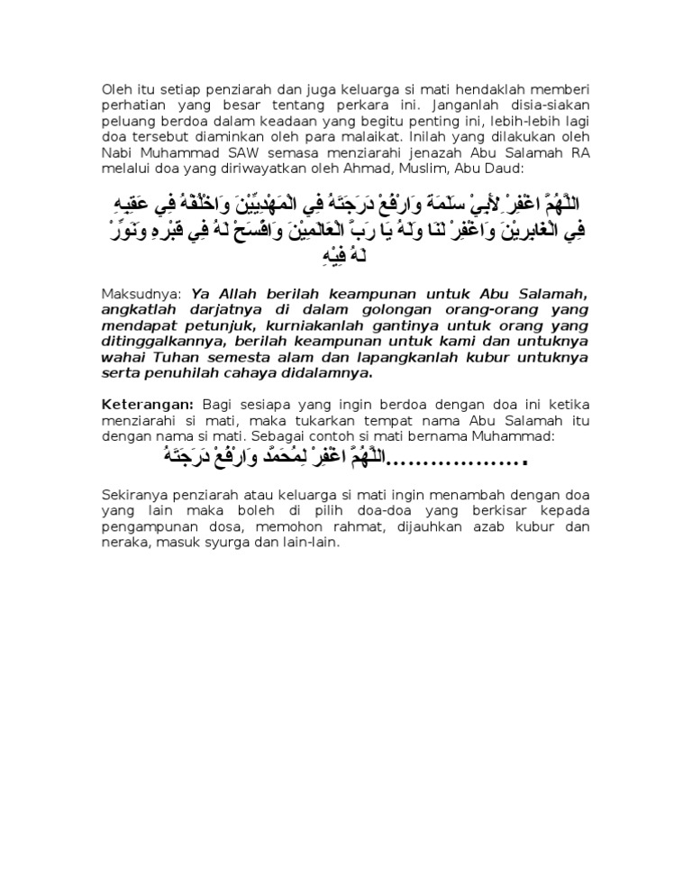 Ziarahlah pada masa tidak ramai dengan ditemani mahram atau suami dan tidak duduk lama di kubur. Doa ketika berziarah pdf sesuai sunnah rasul bacaan doaz ziarah kubur singkat umum orang tua menurut muhammadiyah doa untuk mayit kalimat tahlil membaca yasin di kuburan dan sebagainya. Sep 27 2020 Ziarah kubur ibu bapa juga bakti anak-anak kepada mereka.